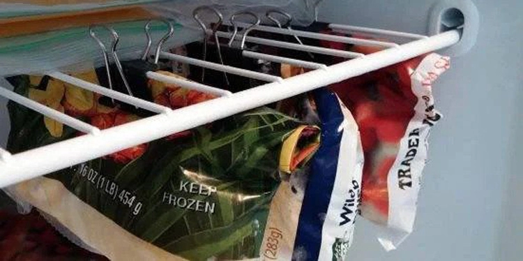 Invest in a set of durable paper clips or chip bag clips specifically for your freezer. As illustrated, these clips can help securely close your bags of frozen veggies, ensuring they hang off the freezer shelf. This not only prevents accidental spills but also creates the illusion of a more spacious freezer, making it easier to access and manage your frozen goods.