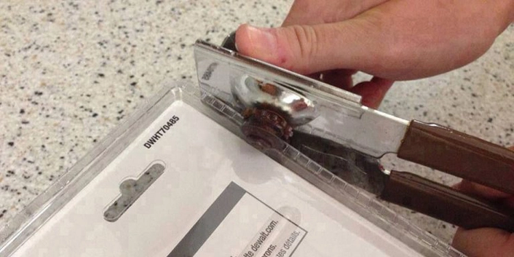 Approach opening a rigid plastic package as if you're opening a can. Align the can opener along the package's edge, secure a firm grip, and start turning the tool as you would with a can. You'll find it surprisingly simple to slice through the packaging, making the process of opening these plastic fortresses as easy as pie!